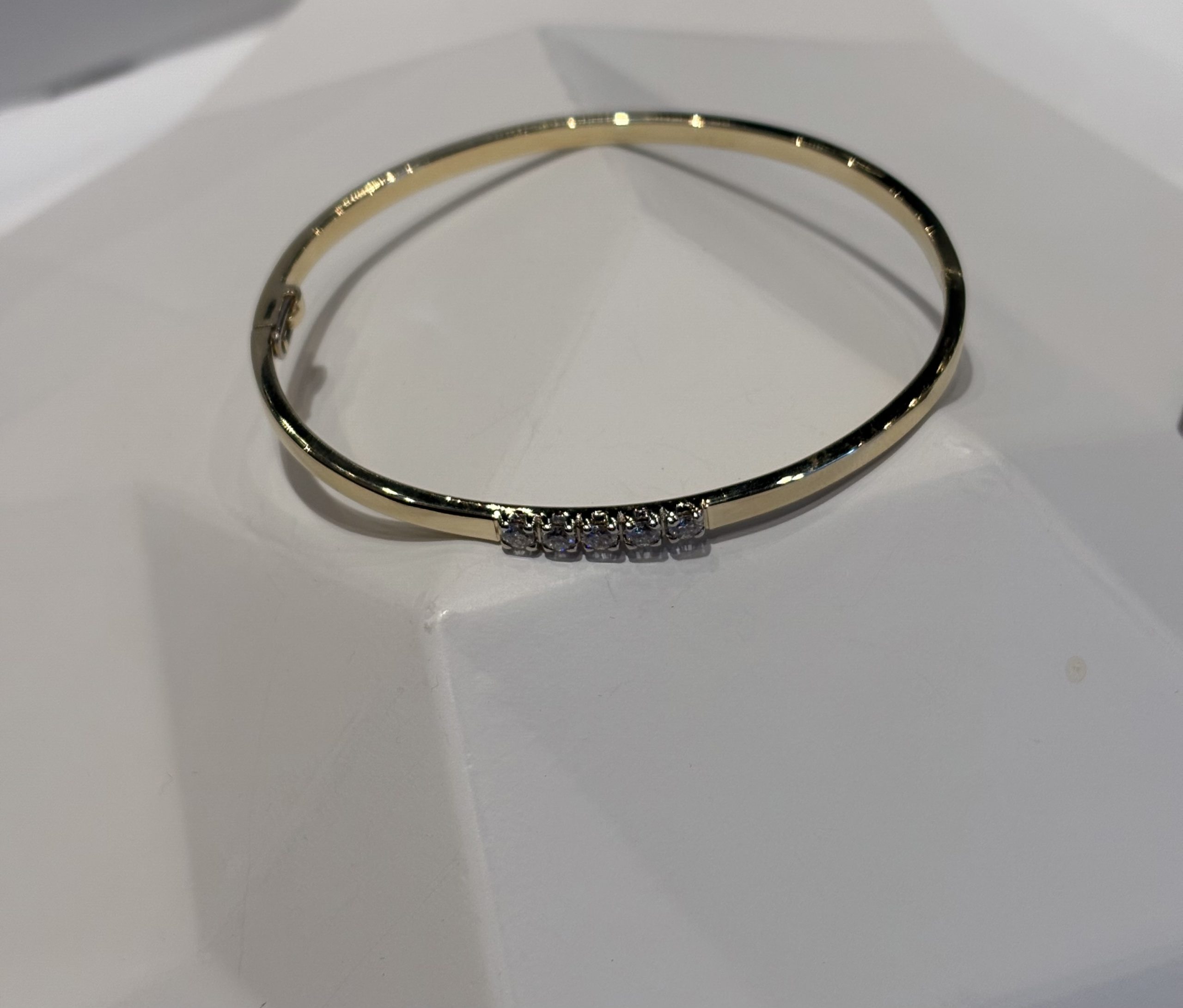 Bicolor 14 karaats geel- met witgouden rivièrearmband met vijf briljanten elk 0,08ct.