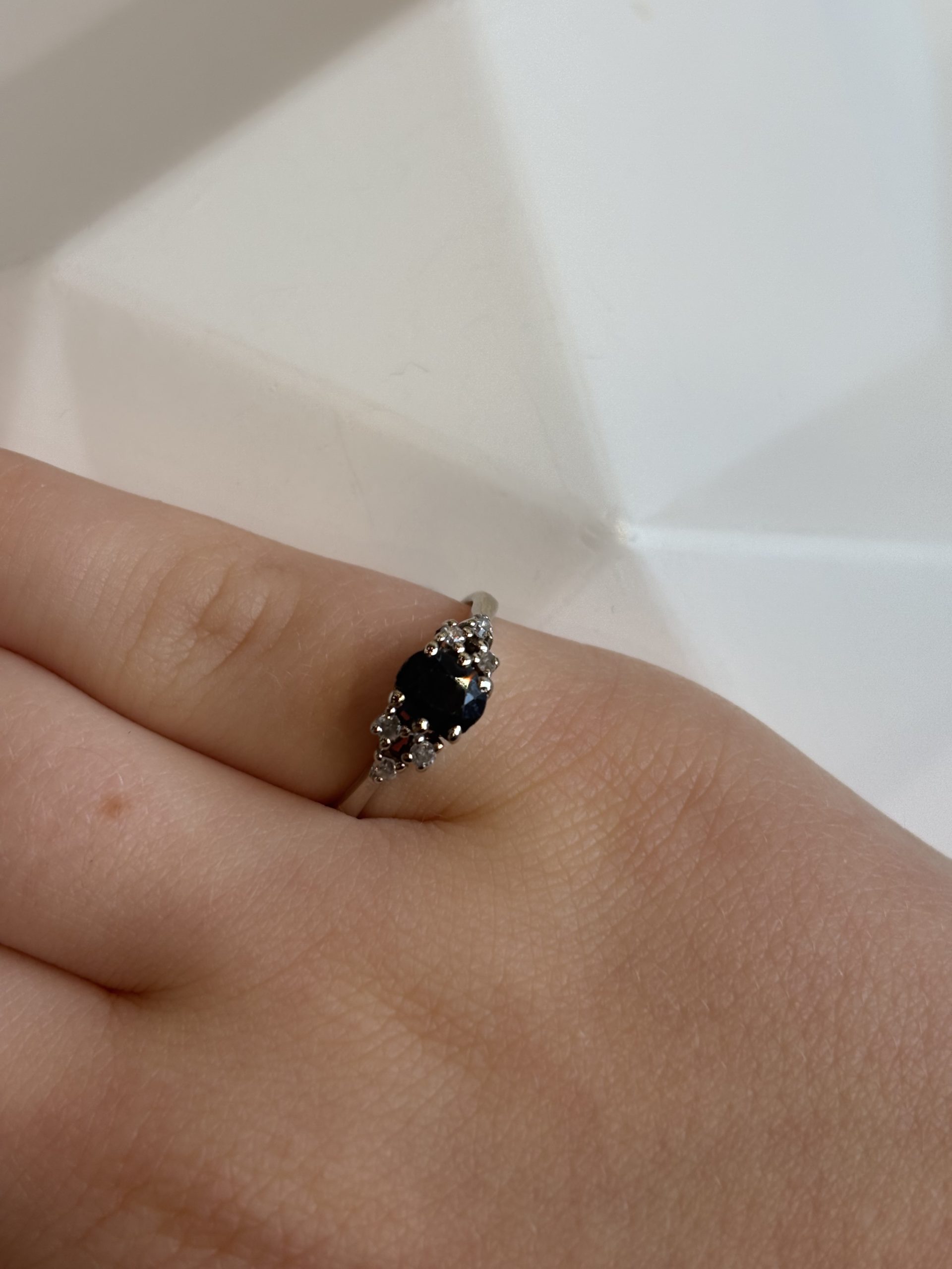 14 karaats witgouden ring met een ovaal geslepen saffier van 0,45ct en aan weerszijde drie achtkant geslepen diamanten van elk 0,01ct.